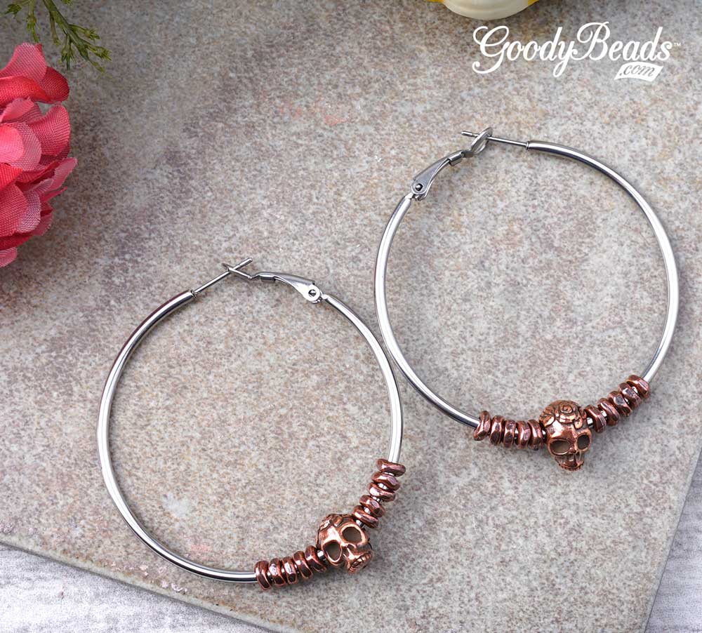 It’s the first day of October and what a good way to start this DIY month with some skull earring for Halloween! These earring are also perfect for skull lovers, like our Designer Heidi. She designed these earrings using hoop earrings in three different sizes (60mm, 50mm, 40mm) as the base, TierraCast skull beads and various metal beads.
