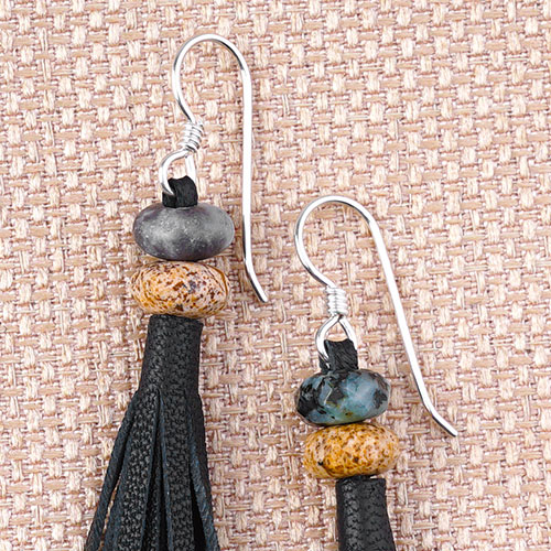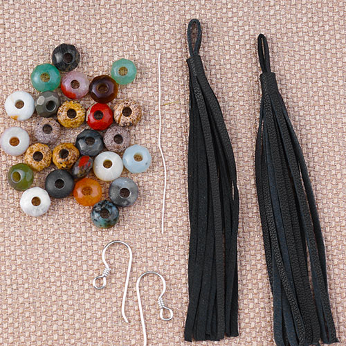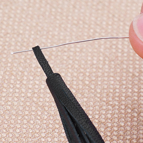 8. Slide on an onyx bead, spacer, 3 onyx beads, spacer and another onyx bead. Slide end cap and 3 inches of leather and end cap. Slide on Cellini spiral, onyx bead, spacer, 3 onyx beads, spacer and another onyx bead. Slide on another end cap, 3 inches of leather and end cap.