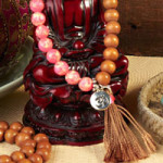Mala is a strand of counting beads used in Hindu or Buddhist practice for praying or reciting a mantra to aid concentration during meditation. A typical mala is made with 108 beads that are strung with a knot tied in between each bead. Depending on the type of chant, counts of strung beads may vary. It is said that with each knot, people recite a mantra to bless the beads. The strand is also accompanied with a larger bead named the “Guru” bead and a tassel.