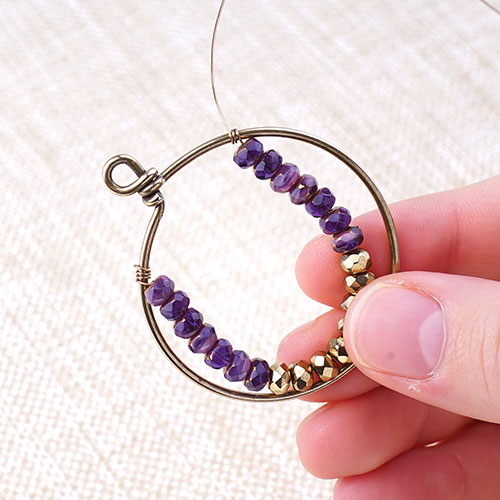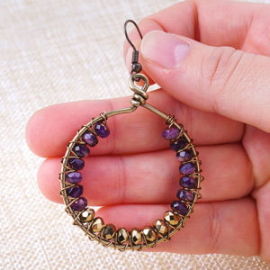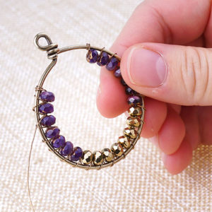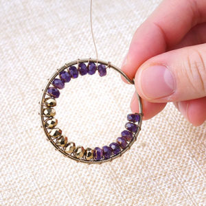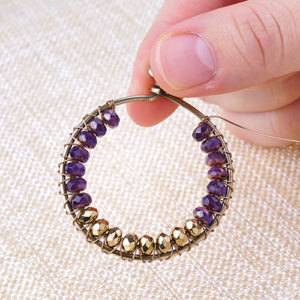 We made this bracelet using wavy disc and the popular gray lava beads. Cut a 9″ soft flex wire. Slide on 9 lava beads. Slide on 10 wavy discs by sliding one bead concave out and slide another concave in so that the two discs cup together. Repeat for the rest. Then slide on 9 more lava beads. You can add more lava beads to either sides to customize your wrist size. Slide on a crimp tube to one end and loop of your clasp. Loop flex wire back through the crimp tube and crimp your tube. Cut flex wire with a 1/4″ tail. Repeat to other end but adding a jump ring.