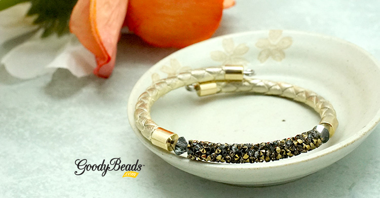 End cap, leather, end cap, bicone crystal, fine rocks tube, bicone crystal, end cap, leather and end cap. - Cut wire end with 3/4″ wire left with memory wire cutters and make a simple loop with memory finishing pliers.