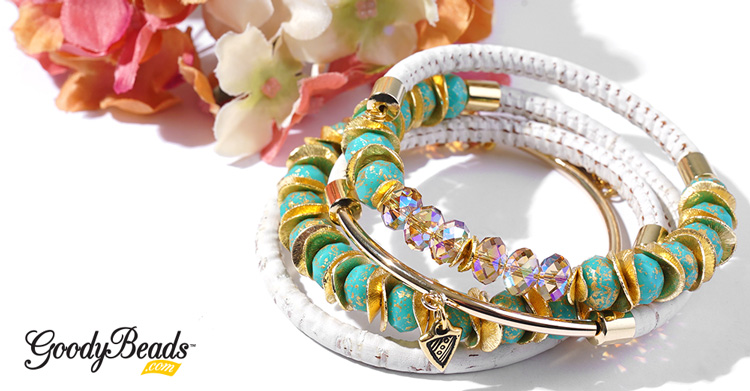 Design this fancy Golden Turquoise Wrap Bracelet with memory wire, Czech beads, Swarovski® crystals, cork cord and curve tube with loop.