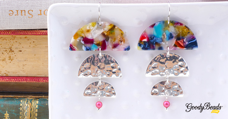 Tory’s pair of earrings are bold and bright. They feature some of our newest products like acetate components, Textured Half Circle Connectors and Swarovski® pearls in a Mulberry color. We just LOVE the tiered look in these earrings and the vibrant colors from the Mulberry complementing the acetate half circle.